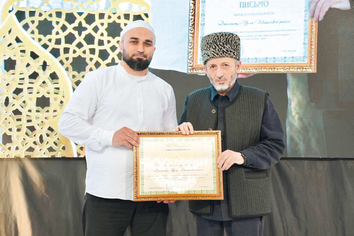 Мажлисалъул ахиралда шайих АхIмад-афандияс Баркалаялъул кагъат кьуна районалъул бетIер Мухтар ХIалалмухIаммадовасе, депутат ва сахаватчи МикагIил Ибрагьимовасе.