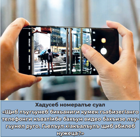 - БукӀана нижер лъималазул смартфон, жакъа гьечӀо. Гьениб эбел-инсуда барабги гIемер буго. Эмен хӀалтӀуда, эбел рокъосел пишабазда рукӀиналъ, гьезда хадуб халкквезе щоларо ва гьел къваригӀел гьечӀел ишазда ратула. Школалде ва цогидаб бакӀалде араб мехалъ, кир ругелали лъазе букIине цо гьитӀинабго телефон (фонарик) бугони гIела.