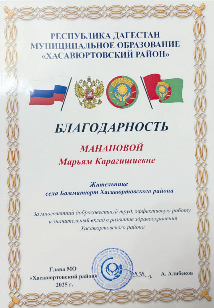 Ерли халкъны разилигин къазанып, къыйышып ишлесе де, Марьям янгыз къалгъан анасыны янына оьзюн чыгъартмакъны тилей. Йиберме сюймесе де, гьалны англап, ону Боташюртгъа бакъдыра. Янгы еринде де жагь кюйде ишге гиришип, гьар-тюрлю къыйынлыкълагъа чул бермей, жагьил медсестра адамлагъа болагъан кёмегин эте, ишин намуслу кюйде кюте. Сонг Марьямны ишлеме медиклери ёкъ Османюртгъа чыгъарта. Онда да ол хыйлы мезгилни яяв аякъдан ёл юрюген. Аврувланы, яшгъа токътагъан къатынланы уьйлерине ол кёп баргъан. Гьатта ювукъ арадагъы юртлагъа да чакъырып, Марьям бир аврувну да кёмексиз къоймагъан. Чакъ иссими, сувукъму, янгур яда къар яваму-явмайму деп къарамай, яяв кюйде Марьям кёмегине къарагъан гьар адамгъа табылгъан. Шолай авур шартлада Марьям Манапова 55 йыл ишлеп пенсиягъа чыгъа.