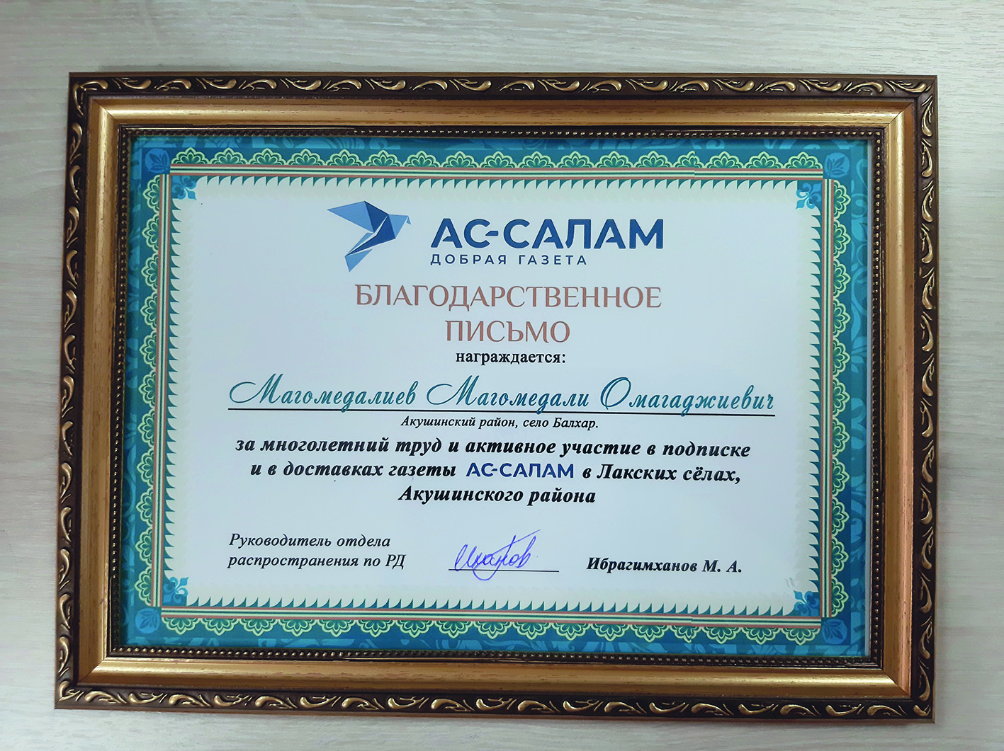 Бархъарав жу цалчинма-цалчин бувхру тамансса шиннардий диндалул ххуллий цащава бюхъайсса кумаг-кабакьаву дуллай хIарачат буллалисса МухIаммадаьлиев МухIаммадаьлил ва ванал кулпатрал Кисараннул къушлийн. МухIаммадаьлил цанма чирилун бакIрайн лавсун, Ахъушиял райондалийсса мукьрагу лакрал шяраву Ас-салам кказит чичин ва биян буван хъунмасса захIмат бивхьуссар, цIанагу угьарасса оьрмулух къаурувгун кумаг буван учIайссар. Мунийн хъунмасса барчаллагьрай ия Ахъушиял райондалийсса Ас-саламрал вакил МахIмуд Рабаданов. Барчаллагь дахьва мукъурттийну къаличIаншиврул, ванал МухIаммадаьлин буллуна цала отделданул каялувчинал чулухасса барчаллагьрал чагъар ва дакIний личIансса бахшиш.