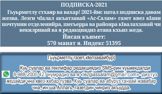 «Эгер вич хуьзвай кас и къайдадилай къерехдиз алатайтIа ва вич чарасуз хуьнин сергьят артухарайтIа, ада вичин крарин патахъай жаваб гуда ва адаз масадан бедендиз набутвилер авунай ва икI мад гузвай жаза гуда».