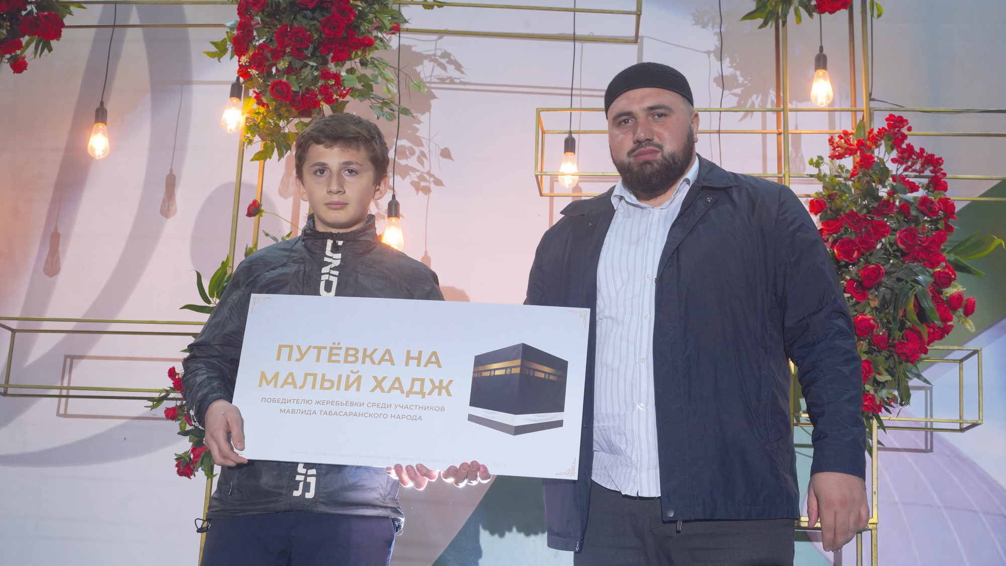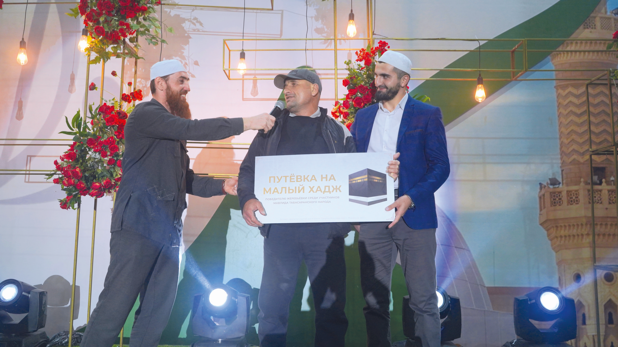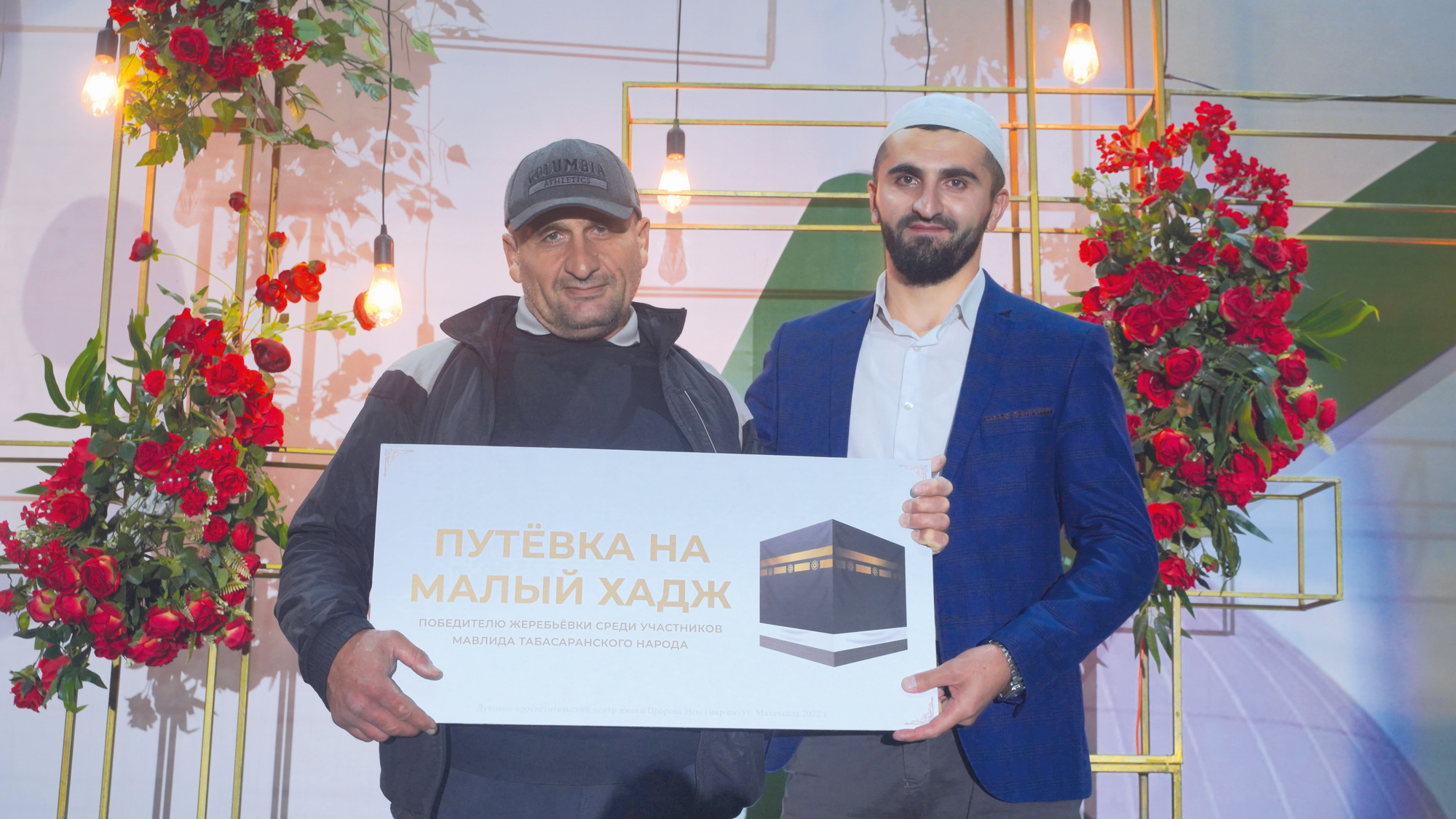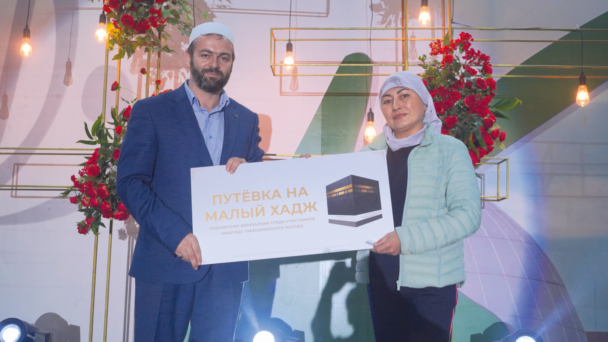 Улхбарин арайиъ жюрбежюр пешкешар туври, розыгрышар апIури гъахьну. Му мажлиснаъ пешкеш вуди уьмрайиз шубуб путевка тувну. Дурарикан саб «Уьмра-гьяж» проектди чпин терефнаан тувуб вуйи. Гъит Аллагьу Тааьла чпикан рази ишри. Дурарикан сабуну путевка Казан шагьриан дуфнайи туристариз кьисмат гъабхьи. Дурар чпи Дербент шагьриъ айиган, гьадушваъ сарихъди таниш духьну, вари сатIиди мажлисназ гъафну, ва гьаму 4 агъзурихьна инсанарин арайиан Аллагьу Тааьлайин амриинди сабуну путевка гьадму дишагьлийиз кьисмат гъабхьну. Сягьнайиина удучIган, уларилан нивгъар гъягъюри, гафаркьан апIуз шуладайи, гьадмукьан шад гъахьнийи. Хъа ухьура ихь терефнаан, му путевка ихь мажлисназ дуфнайи хялариз кьисмат хьуб`ин гизаф рази вухьа. Гъит Аллагьу Тааьлайи уьмра кьисмат гъабхьидариз сагъ-саламатди душну, уьмра тамам дапIну кьяляхъ гъюру агьларикан апIри.